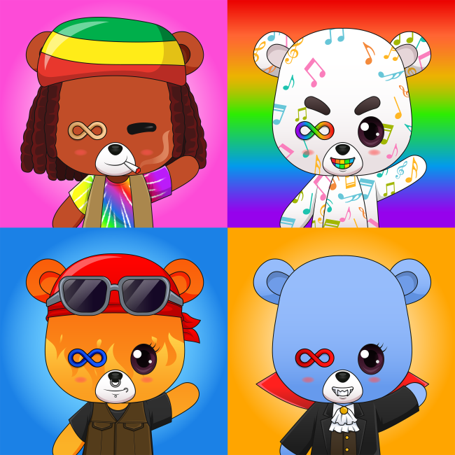 Each NFT is created manually one by one (non generated) with different rarity values. It includes 27 super rare (0.05%) “Infinity Eye” bears.